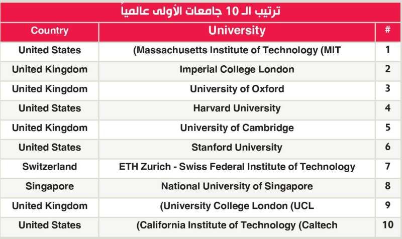 وفي لائحة ترتيب الـ 10 جامعات الأولى عالمياً، فقد حافظ معهد ماساتشوستس للتكنولوجيا (MIT) في الولايات المتّحدة على مركز الصدارة في لائحة الـTop 10.
