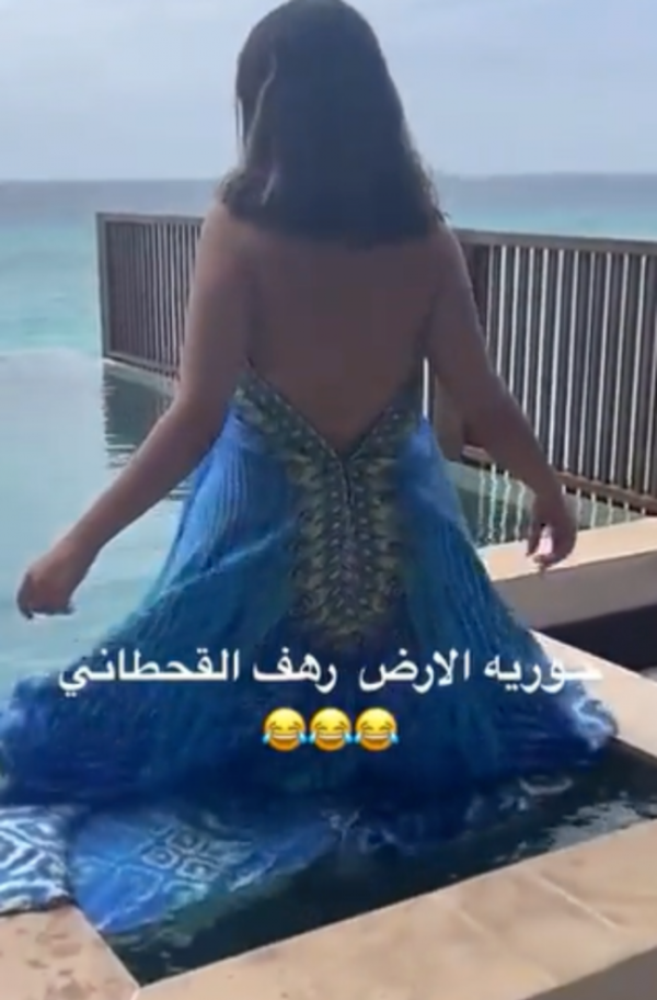 كما ظهرت رهف القحطاني بصورة أخرى وهي تنزل إلى مياه البحر، مرتدية فستانا أزرق مكشوف الظهر، ووصفت نفسها بحورية الأرض، مما عرضها للسخرية أيضا.