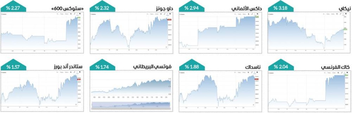 وفي ألمانيا، قاد مؤشر داكس موجة الصعود، مرتفعاً إلى 25,261.64 نقطة، مقابل 24,539.34 نقطة في الإغلاق السابق، مسجلاً زيادة قوية بلغت 2.94 %.