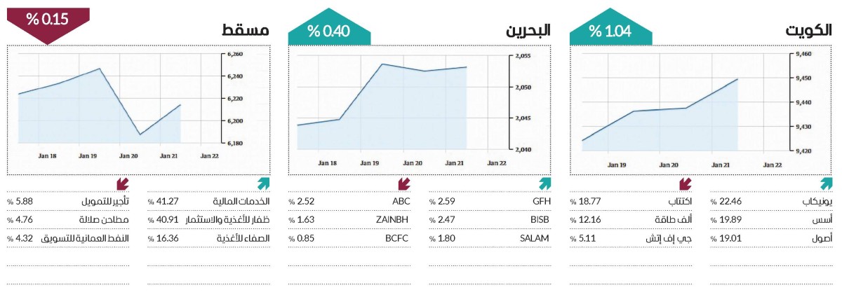 وفي الكويت، شهدت مؤشرات الأسهم الرئيسية محصلة خضراء بدعم من ارتفاع 12 قطاعاً. وصعد مؤشر السوق الأول بنحو 1.04% منهياً التعاملات عند مستوى 9449.36 نقطة، كما ارتفع مؤشر السوق العام بنسبة 1.32% وصولاً إلى 8864.81 نقطة.