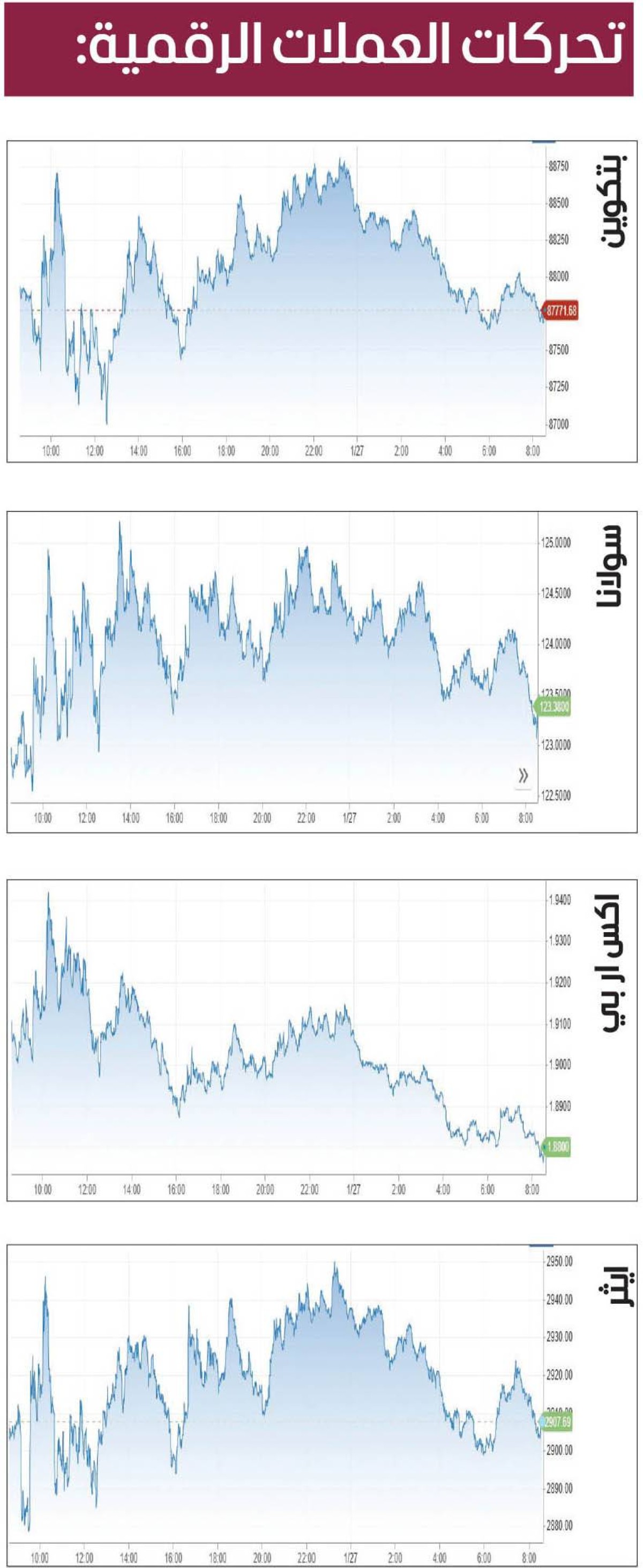 ابوظبي - ياسر ابراهيم - الخميس 29 يناير 2026 12:06 صباحاً - ارتفعت العملة الرقمية المشفرة «بتكوين» بشكل طفيف، أمس، لكنها تتحرك ضمن نطاق ضيق، دون مستوى 88 ألف دولار، قريبةً من أدنى مستوياتها في شهر، مع بقاء المستثمرين حذرين مع اجتماع السياسة النقدية لمجلس الاحتياطي الفيدرالي، وإظهار شهية محدودة للأصول عالية المخاطر.