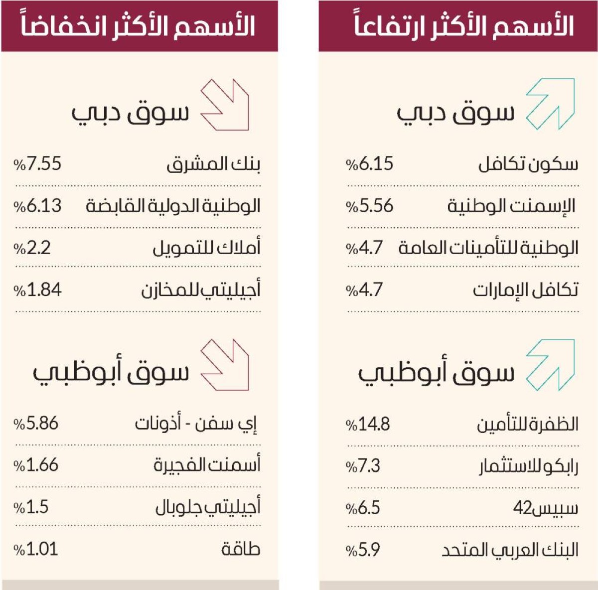 وارتفع في سوق أبوظبي أسهم الظفرة للتأمين 14.8 % بالحد الأقصى، ورابكو للاستثمار 7.3 %، وسبيس42 6.5 %، والبنك العربي المتحد 5.9 %.