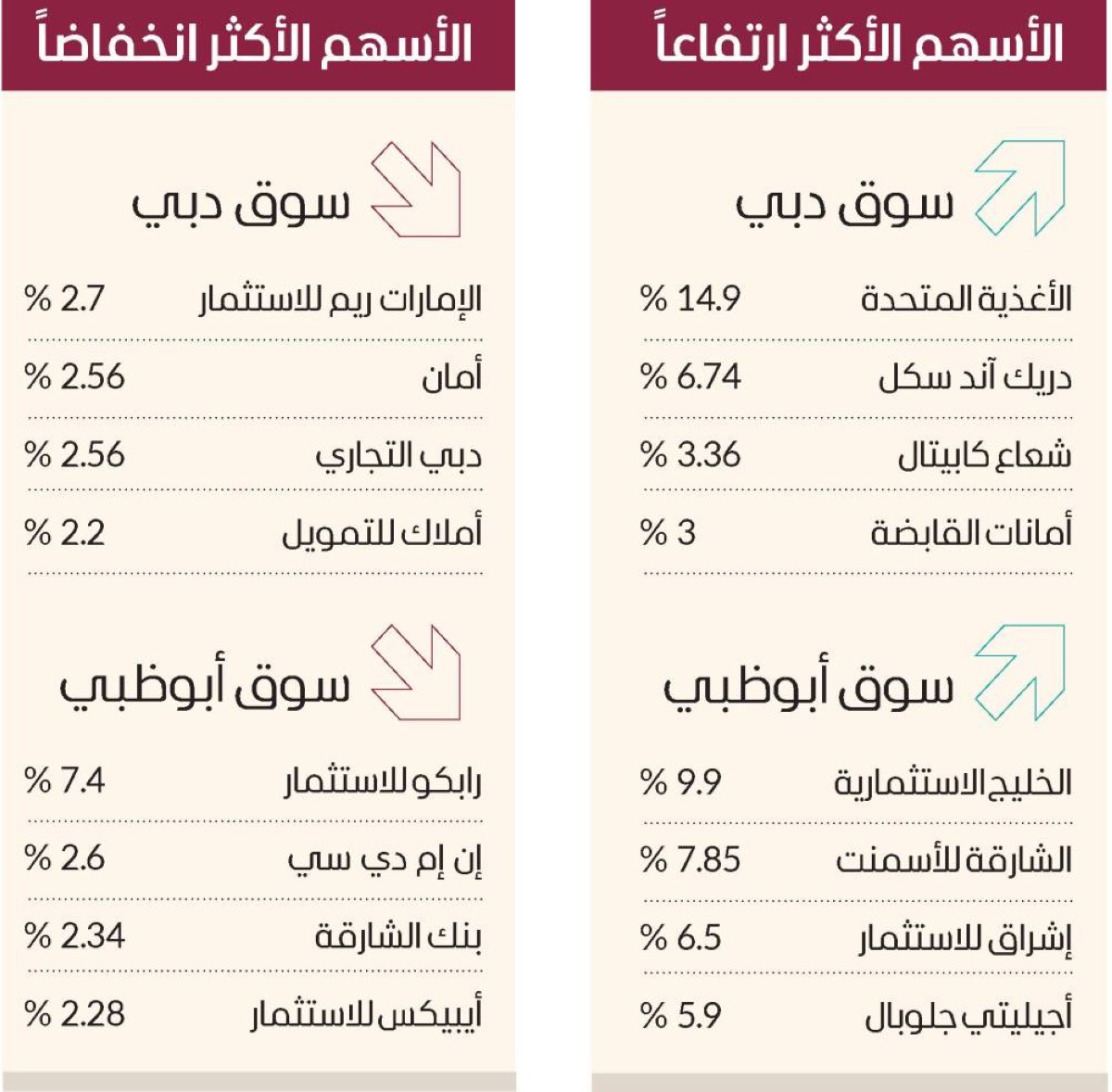وارتفع في سوق أبوظبي أسهم الخليج اﻻستثمارية 9.9%، والشارقة للأسمنت 7.85%، وإشراق للاستثمار 6.5%، وأجيليتي جلوبال 5.9%، في المقابل، انخفضت أسهم رابكو للاستثمار 7.4%، وإن إم دي سي 2.6%، وبنك الشارقة 2.34%، وأيبيكس للاستثمار 2.28%.