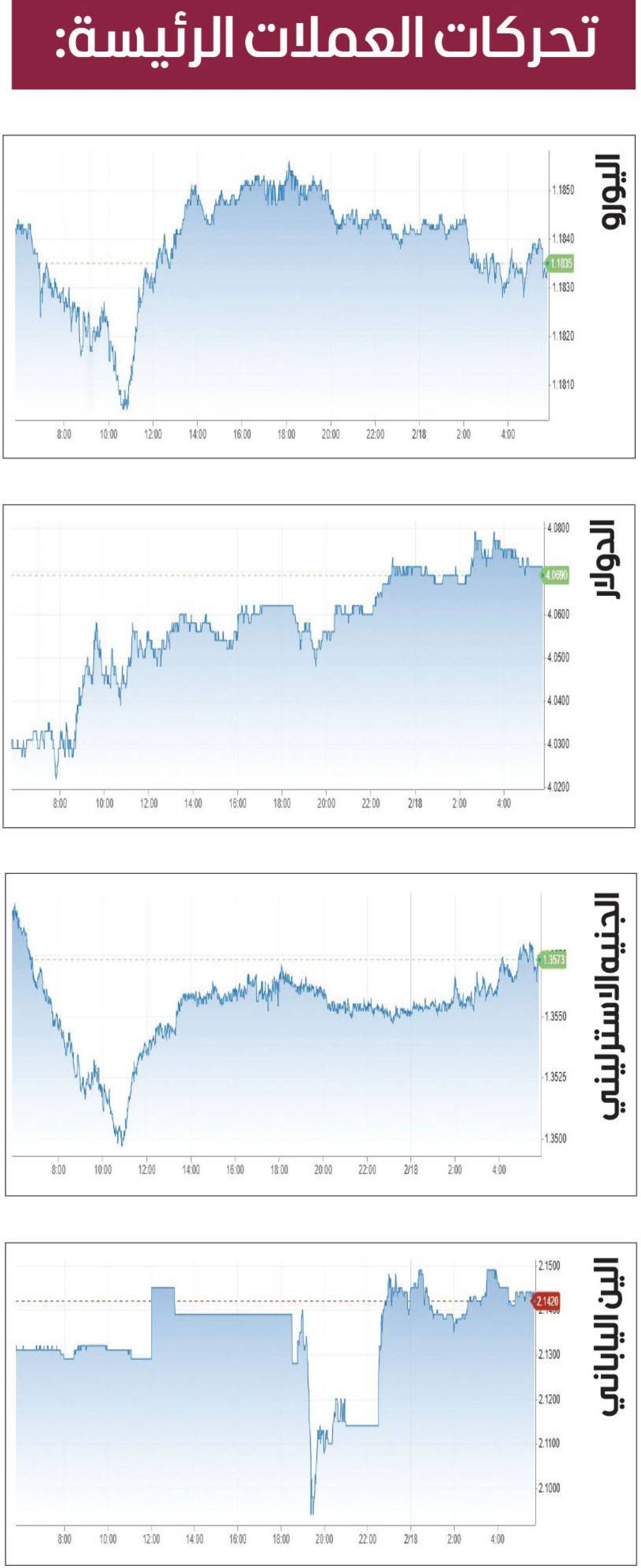 وصعد مؤشر الدولار، الذي يقيس أداء العملة الأمريكية مقابل سلة من العملات، 0.1% ليسجل 97.23 نقطة، وتراجع اليورو 0.09% إلى 1.1842 دولار، وهبط الين 0.2% إلى 153.56 للدولار، ونزل الجنيه الاسترليني 0.1% إلى 1.3554 دولار بعد تراجع 0.5% الثلاثاء. ومن المقرر أن تصدر لجنة السوق المفتوحة محضر الاجتماع، الذي عقد في يناير، الأربعاء، بينما ستصدر وزارة التجارة يوم الجمعة التقدير الأول للناتج المحلي الإجمالي الأمريكي خلال الربع الرابع. وانخفض الدولار الأسترالي 0.3% إلى 0.7065 دولار، وتراجع الدولار النيوزيلندي أيضاً 0.8% إلى 0.5996 دولار.