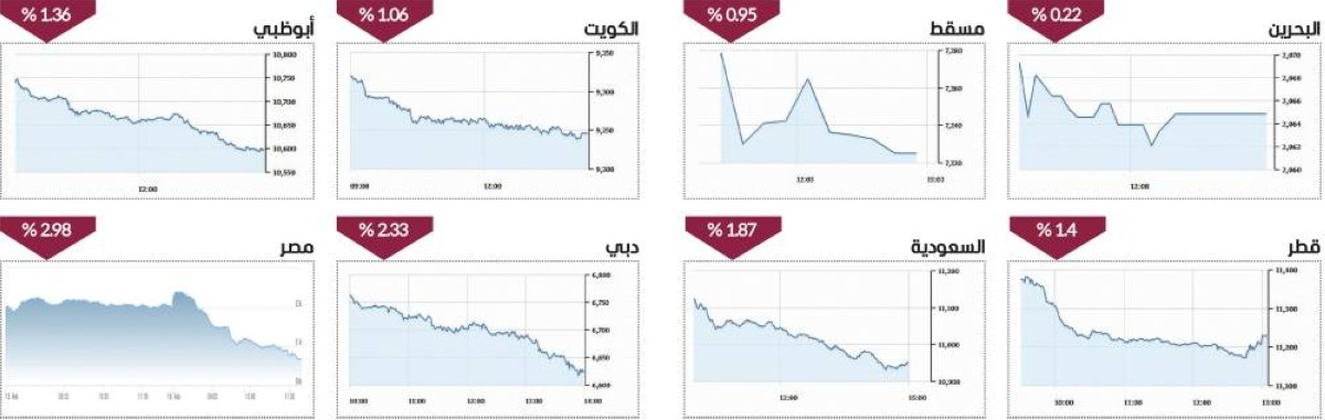 شهدت أغلب مؤشرات البورصات العربية تراجعاً في الأداء، إذ تراجع المؤشر السعودي «تاسي» 1.87%، والكويتي 1.06%، والقطري 1.4%، ومسقط 0.95%، والبحرين 0.22%، وخارج منطقة الخليج، هبط مؤشر بورصة مصر 2.98%.
