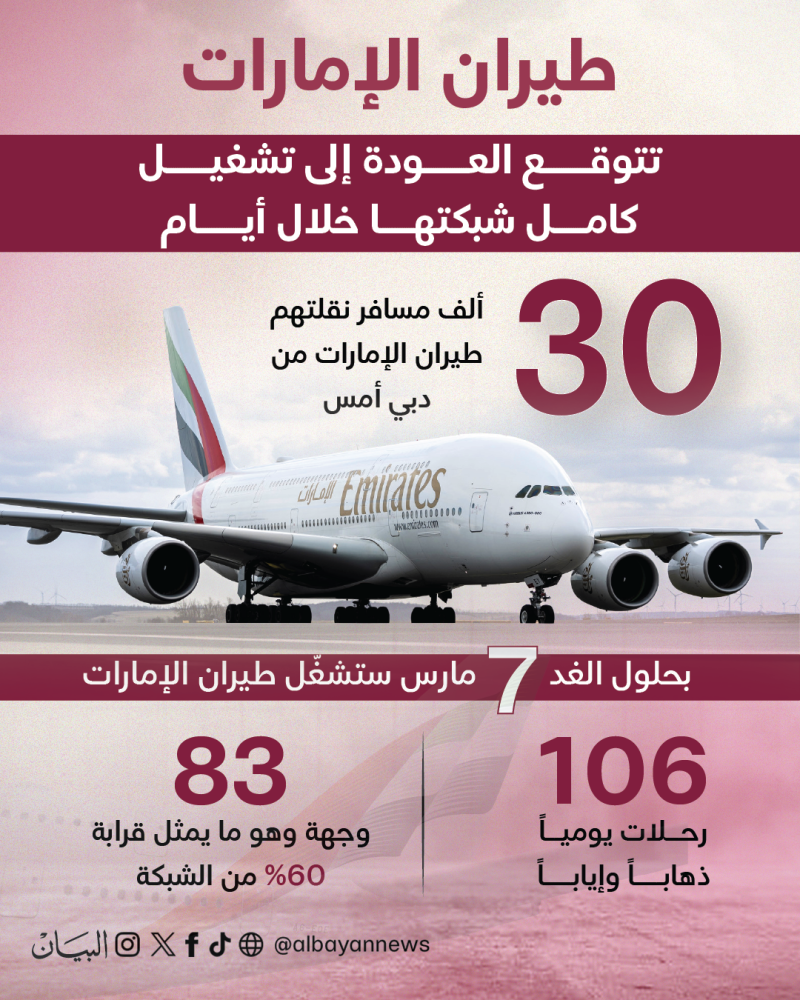 ابوظبي - ياسر ابراهيم - الجمعة 6 مارس 2026 09:36 مساءً - توقعت طيران الإمارات العودة إلى تشغيل كامل شبكتها خلال الأيام القليلة المقبلة، وذلك رهناً بتوافر المجال الجوي واستيفاء جميع المتطلبات التشغيلية.