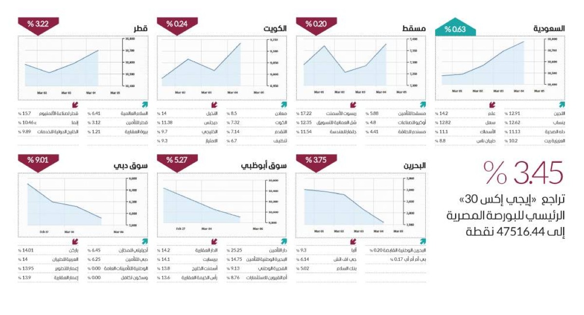 ابوظبي - ياسر ابراهيم - السبت 7 مارس 2026 12:36 صباحاً - تلونت أغلب مؤشرات الأسواق العربية باللون الأحمر خلال الأسبوع الماضي، فيما خالف مؤشر السوق السعودي «تاسي» الاتجاه المتراجع للأسواق، وتباين أداء البورصات الخليجية بين التعافي في بعض القطاعات، لا سيما أسهم الطاقة، وتسجيل خسائر في قطاعات أخرى بفعل الضغوط البيعية على بعض الأسهم القيادية.