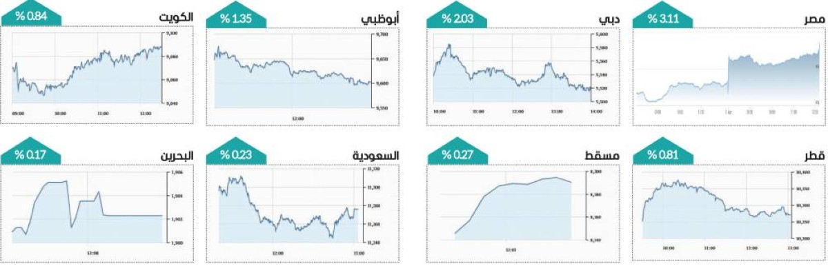 وعلى مستوى البورصات العربية، شهدت مؤشرات الأسواق ارتفاعاً جماعياً في الأداء، وارتفع المؤشر السعودي «تاسي» 0.23 %، والكويتي 0.84 %، والقطري 0.81 %، ومسقط 0.27%، والبحرين 0.17 %، وخارج منطقة الخليج، صعد مؤشر بورصة مصر 3.11 %.