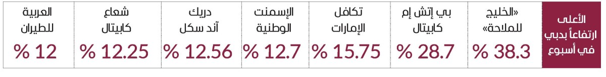 وتصدّر سهم «الخليج للملاحة» ارتفاعات أسهم سوق دبي في 5 جلسات، ليقفز 38.3 %، وارتفعت أسهم بي إتش إم كابيتال 28.7 %، وتكافل الإمارات 15.75 %، والإسمنت الوطنية 12.7 %.