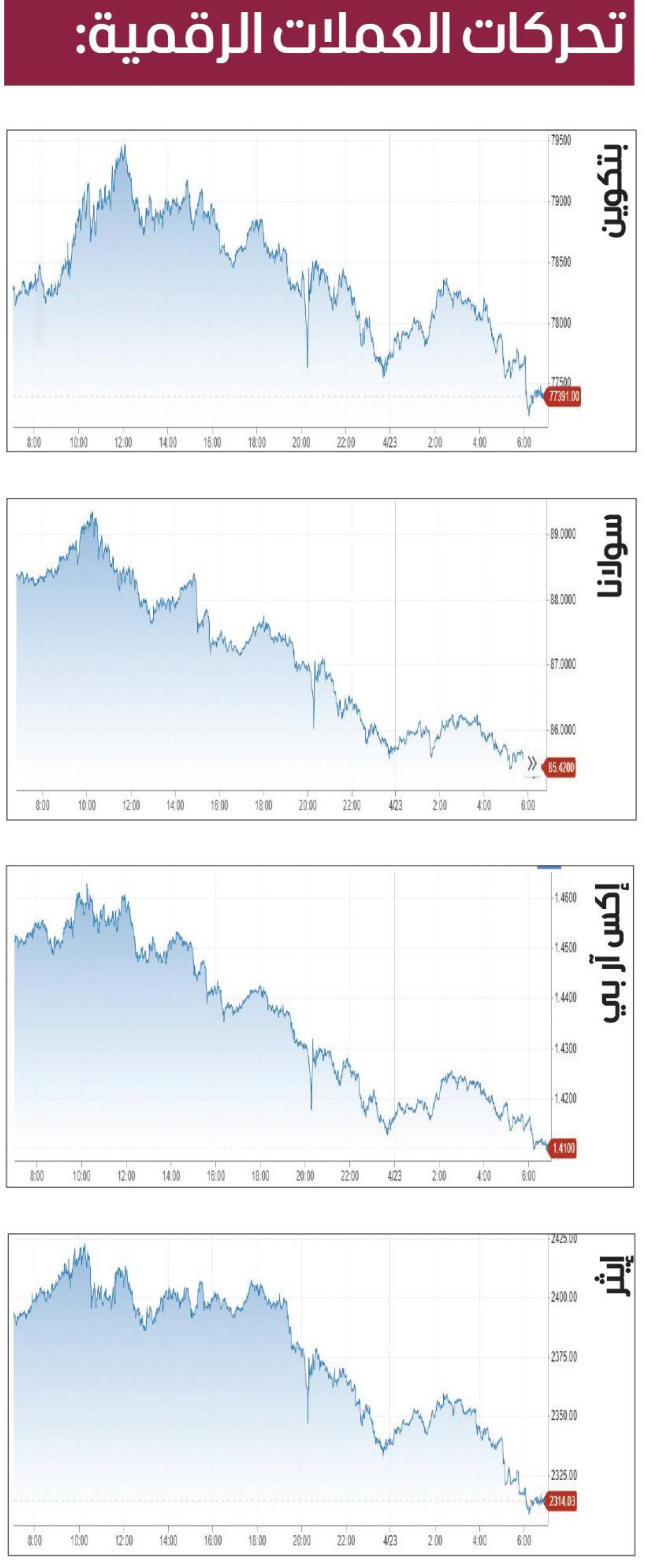 ابوظبي - ياسر ابراهيم - السبت 25 أبريل 2026 04:06 مساءً - انخفضت أسعار العملات المشفرة أمس، إثر استمرار حالة عدم اليقين بشأن التوترات في الشرق الأوسط، في وقت تنتظر فيه الولايات المتحدة رداً من إيران قبل استئناف محادثات السلام.