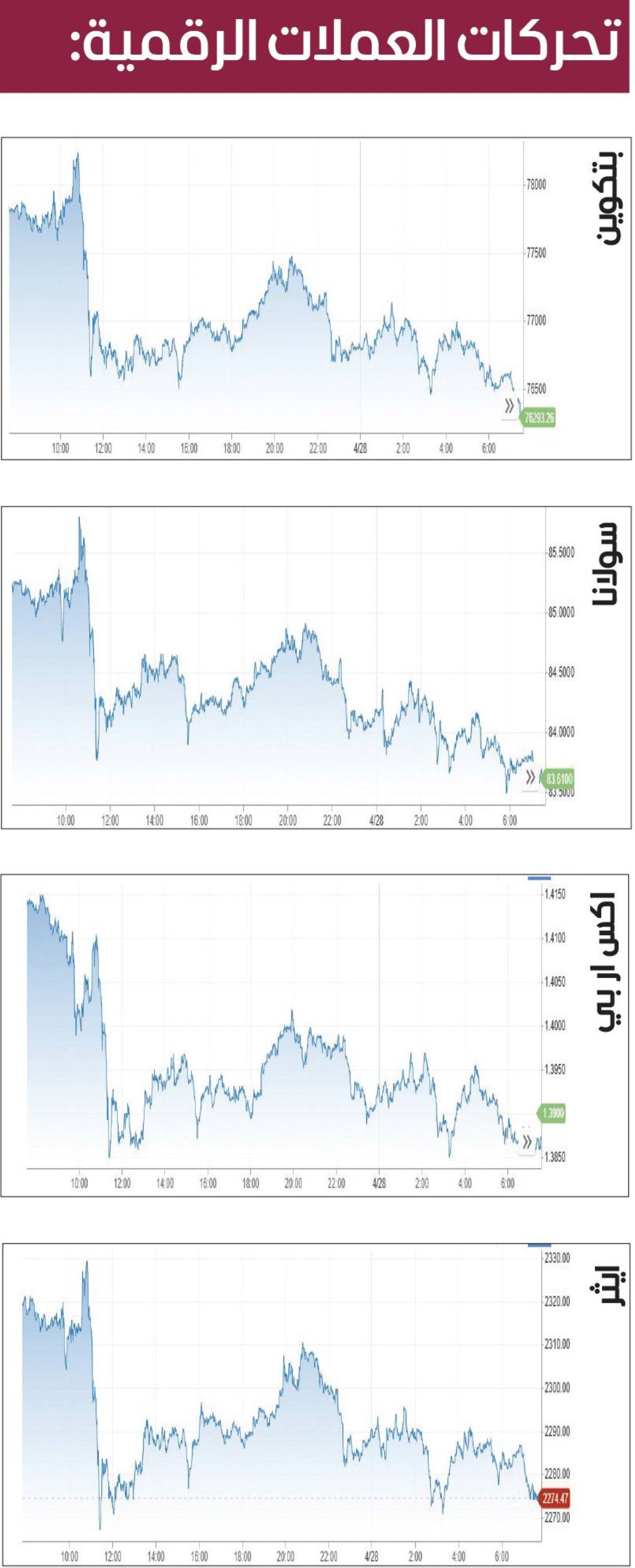 ابوظبي - ياسر ابراهيم - الأربعاء 29 أبريل 2026 12:21 صباحاً - استقر سعر عملة بتكوين المشفرة عند نحو 76.5 ألف دولار، أمس، بعد أن لامست حاجز الـ79.5 ألف دولار، مع ترقب التطورات بشأن المحادثات الأمريكية الإيرانية لإنهاء الصراع في الشرق الأوسط.