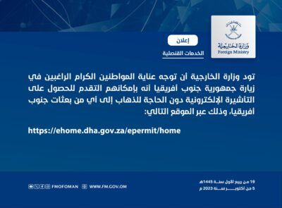 وجهت وزارة الخارجية عبر حسابها الرسمي على موقع التواصل الاجتماعي اكس تنويهًا للمواطنين الراغبين في زيارة جمهورية جنوب أفريقيا أنه بإمكانهم التقدم للحصول على التأشيرة الإلكترونية دون الحاجة للذهاب إلى أي من بعثات جنوب أفريقيا.