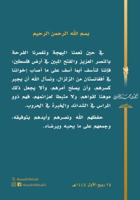 قال سماحة الشيخ احمد بن حمد الخليلي مفتي عام سلطنة عمان عبر حسابه الرسمي على موقع التواصل الاجتماعي اكس ” انه في حين تعمنا البهجة وتغمرنا الفرحة بالنصر العزيز والفتح المبين في أرض فلسطين؛ فإننا لنأسف أيما أسف على ما أصاب إخواننا في أفغانستان من الزلزال، ونسأل الله أن يجبر كسرهم وأن يصلح أمرهم، وألا يجعل ذلك المراس في الشدائد والخبرة في الحروب. حفظهم الله ونصرهم وأيدهم بتوفيقه، وجمعهم على ما يحبه ويرضاه.