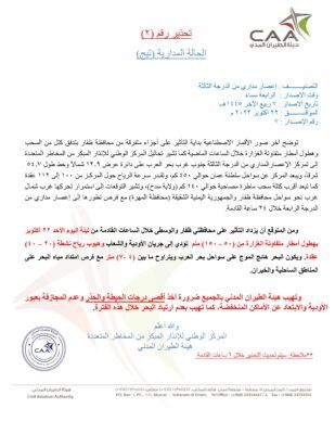وتهيب هيئة الطيران المدني بالجميع ضرورة أخذ أقصى درجات الحيطة والحذر وعدم المجازفة بعبور الأودية والابتعاد عن الأماكن المنخفضة، كما تهيب بعدم ارتياد البحر خلال هذه الفترة.