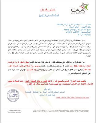 اصدرت الارصاد الجوية العمانية التحذير رقم 3 للحالة الجوية على بحر العرب حيث تشهد محافظة ظفار بداية التأثير المباشر للحالة المدارية بتدفق كتل من السحب الماطرة متفاوتة الغزارة وتشير تحاليل المركز الوطني للإنذار المبكر من المخاطر المتعددة إلى تمركز الحالة المدارية جنوب غرب بحر العرب على دائرة عرض 13.3 شمالاً وخط طول 54.4 شرقاً، ويبعد المركز عن سواحل سلطنة عمان حوالي 350 كم، وتقدر سرعة الرياح حول المركز من 100 إلى 112 عقدة، وتشير التوقعات إلى استمرار تحركها غرب شمال غرب نحو سواحل محافظة ظفار والجمهورية اليمنية الشقيقة (محافظة المهرة) مع فرص تطورها إلى إعصار مداري من الدرجة الرابعة خلال 12 ساعة القادمة.