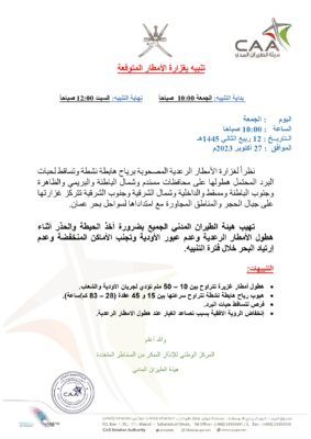 أصدرت الارصاد الجوية العُمانية تنبيهاً لغزارة الأمطار الرعدية المصحوبة برياح هابطة نشطة وتساقط لحبات البرد المحتمل هطولها على محافظات مسندم و شمال الباطنة والبريمي والظاهرة وجنوب الباطنة ومسقط والداخلية وشمال الشرقية وجنوب الشرقية تتركز غزارتها على جبال الحجر والمناطق المجاورة مع امتداداها لسواحل بحر عمان. تهيب هيئة الطيران المدني الجميع بضرورة أخذ الحيطة والحذر أثناء هطول الأمطار الرعدية وعدم عبور الأودية وتجنب الأماكن المنخفضة وعدم إرتياد البحر خلال فترة التنبيه.