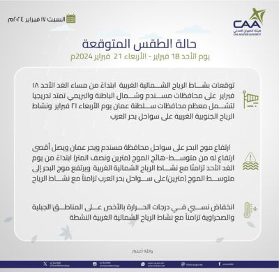 توقعات بنشاط الرياح الشمالية الغربية ابتداءً من مساء الغد الأحد ١٨ فبراير على محافظات مسندم وشمال الباطنة والبريمي تمتد تدريجيا لتشمل معظم محافظات سلطنة عمان يوم الأربعاء ٢١ فبراير ونشاط الرياح الجنوبية الغربية على سواحل بحر العرب