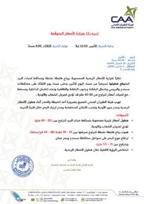 كما تهيب هيئة الطيران المدني الجميع بضرورة أخذ الحيطة والحذر أثناء هطول الأمطار الرعدية وعدم عبور الأودية وتجنب الأماكن المنخفضة وعدم ارتياد البحر خلال فترة التنبيه.