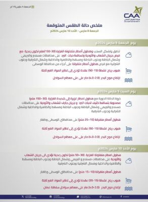 أصدرت هيئة الطيران المدني ملخصا بحالة الطقس خلال ٣ أيام ابتداءا من اليوم الجمعة وحتى الأحد القادم