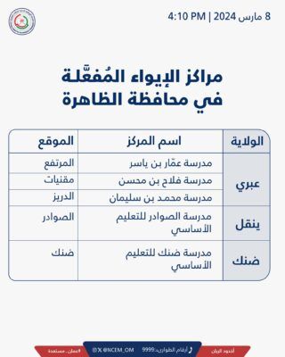 نشرت اللجنة الوطنية لإدارة الحالات الطارئة قائمة بمراكز الإيواء في محافظة الظاهرة كما هو موضح ادناه :