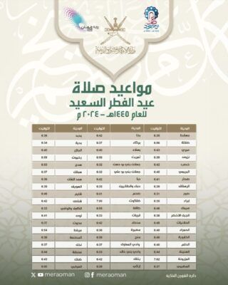 أعلنت وزارة الأوقاف والشؤون الدينية عبر حسابها الرسمي على موقع التواصل الاجتماعي اكس عن مواعيد صلاة عيد الفطر السعيد للعام 1445 هـ – 2024 م في سلطنة عُمان.