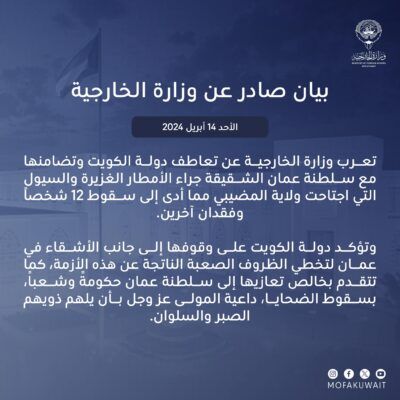 تعرب وزارة الخارجية عن تعاطف دولة الكويت وتضامنها مع سلطنة عمان الشقيقة جراء الأمطار الغزيرة والسيول التي اجتاحت ولاية المضيبي مما أدى إلى سقوط 12 شخصاً وفقدان آخرين. وتؤكد دولة الكويت على وقوفها إلى جانب الأشقاء في عمان لتخطي الظروف الصعبة الناتجة عن هذه الأزمة، كما تتقدم بخالص تعازيها إلى سلطنة عمان حكومةً وشعباً، بسقوط الضحايا، داعية المولى عز وجل بأن يلهم ذويهم الصبر والسلوان.