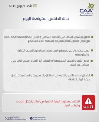 أصدرت الأرصاد الجوية ملخص حالة الطقس لليوم كما هو موضح ادناه :