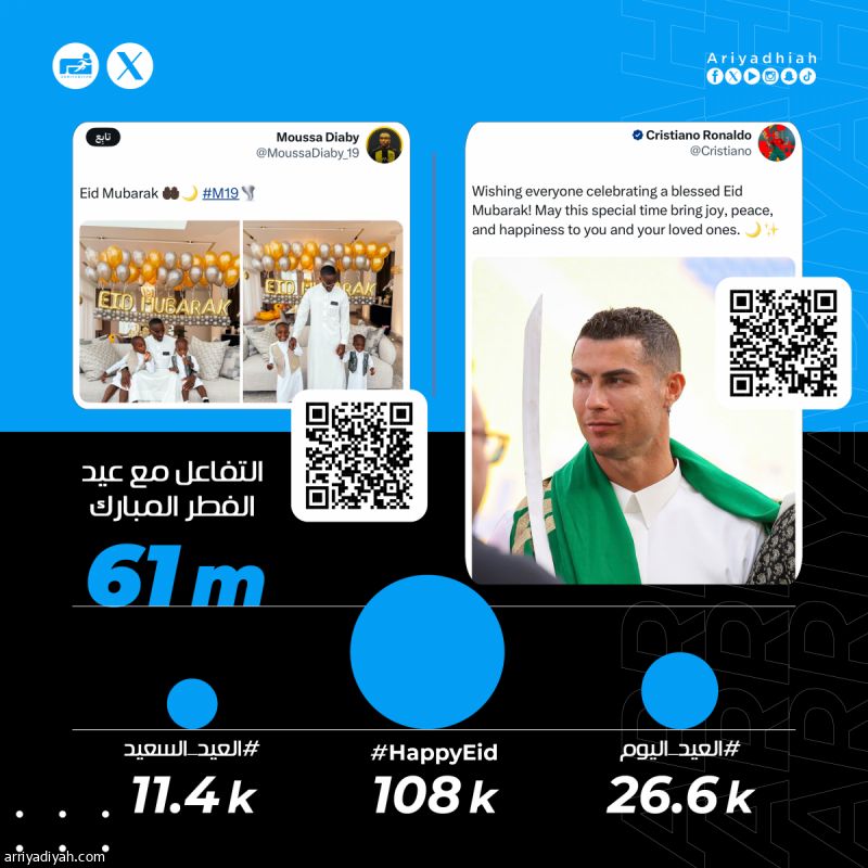 ومن بين أول اللاعبين الذي قدَّموا تهنئتهم بحلول العيد الأسطورة البرتغالية كريستيانو رونالدو، مهاجم وقائد فريق النصر الأول لكرة القدم، قائلًا: «أتمنى للجميع عيدًا مباركًا! عسى أن يحمل هذا العيد المبارك الفرح والسلام والسعادة لكم ولأحبائكم»، كما شارك موسى ديابي، جناح الاتحاد، الفرحة بالعيد واضعًا صورتين له مع عائلته وعلَّق «عيد مبارك»، ونشر الجابوني إيميريك أوباميانج صورة له خلال التدريبات ممازحًا زميله محمد قاسم: «عيد مبارك على الجميع.. يا أخي دعني أذهب لتناول الطعام الآن»، واكتفى السنغالي خاليدو كوليبالي والبرازيلي مالكوم، ثنائي الهلال، بـ «عيد مبارك»، وبثَّ الإيفواري فرانك كيسيه، لاعب وسط الأهلي، صورة له بالزي السعودي معلقًا عليها «عيد مبارك»، وكتب الفرنسي محمد سيماكان، مدافع النصر: «عيد مبارك تقبل الله منا ومنكم أعمالنا الصالحة».