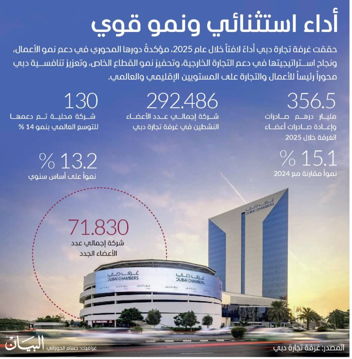 فقد حققت غرفة تجارة دبي، إحدى الغرف الثلاث العاملة تحت مظلة غرف دبي، رقماً قياسياً هو الأعلى في تاريخها في قيمة صادرات وإعادة صادرات الأعضاء خلال العام 2025، بقيمة بلغت 356.5 مليار درهم مقارنة بـ309.6 مليارات درهم في العام 2024، وبنسبة نمو بلغت 15.1%.