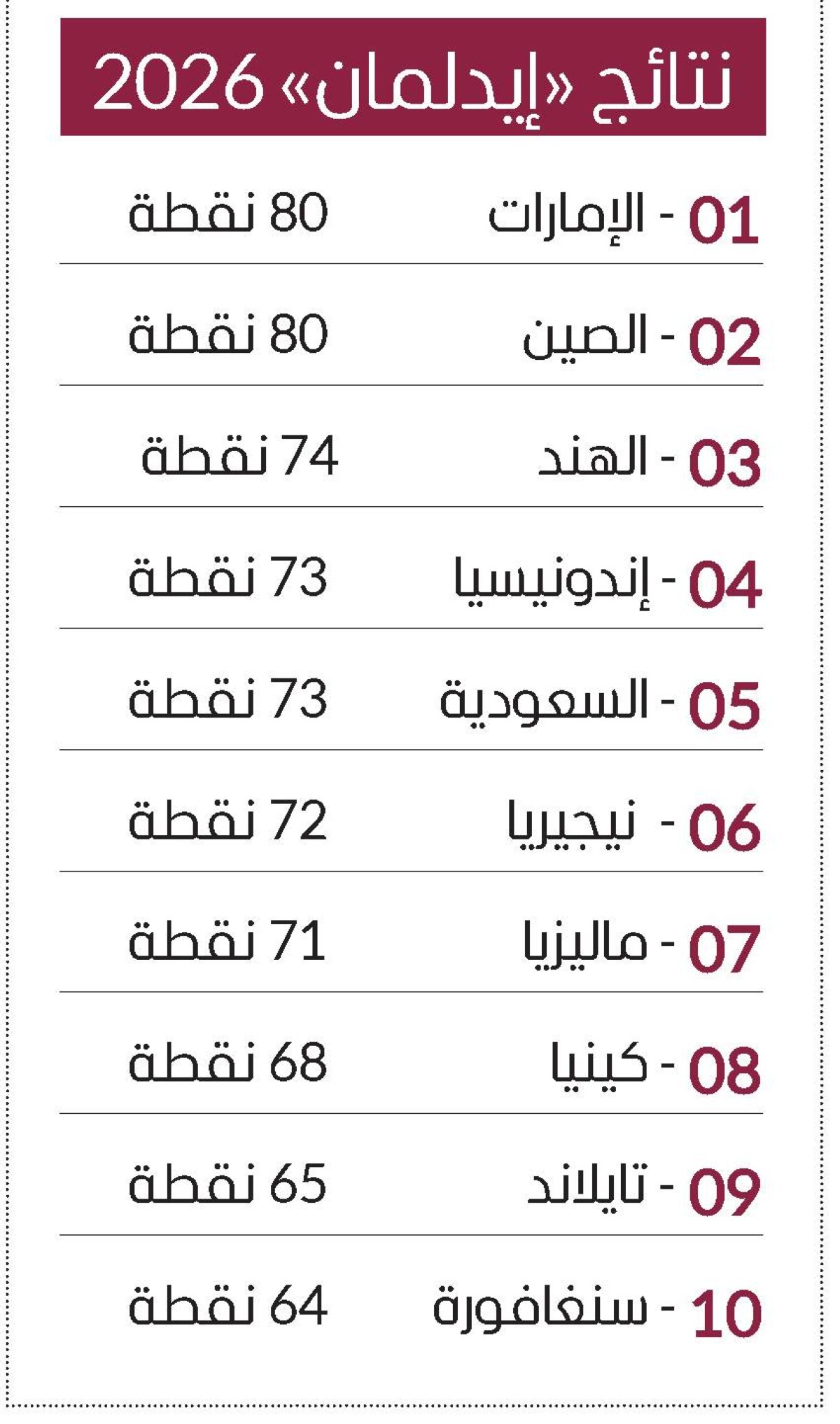 وأظهر الاستطلاع السنوي الذي تجريه «إيدلمان»، أن الإمارات شهدت أكبر زيادة في الثقة بالحكومات وقادة الأعمال ووسائل الإعلام خلال في 2025. وتقدمت الصين، التي تصدرت القائمة مع الإمارات، من 77 نقطة العام الماضي إلى 80 نقطة هذا العام؛ أي بقفزة أقل من الإمارات.