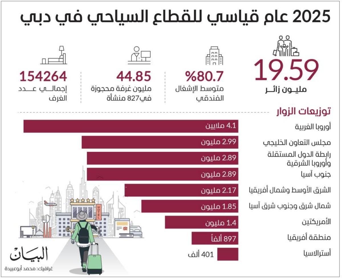 وقال سموه في تدوينة عبر حسابه بمنصة «إكس»: «للعام الثالث على التوالي، يواصل القطاع السياحي في دبي تسجيل أرقام قياسية، فقد رحّبت الإمارة خلال عام 2025 بنحو 19.59 مليون زائر دولي، بنموٍ بلغ 5 % مقارنة بعام 2024، وفقاً لبيانات دائرة الاقتصاد والسياحة في دبي، كما سجّل القطاع الفندقي معدلات إشغالٍ تجاوزت 80 %... زخم الحركة السياحية والمواسم والفعاليات متواصل، مؤكداً أن دبي أصبحت وجهة مفضلة للزوار طوال العام، فهدفنا واضح في ترسيخ مكانة الإمارة ضمن أهم ثلاث وجهات سياحية عالمياً، بما يتماشى مع مستهدفات أجندة دبي الاقتصادية D33... وأهلاً بالعالم في دبي».