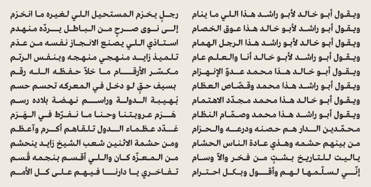 وتكشف الأبيات، التي جاءت بأسلوب حواري بين صاحب السمو الشيخ محمد بن زايد «أبو خالد» وصاحب السمو الشيخ محمد بن راشد «أبو راشد»، عن قراءة شعرية لسمات القيادة، حيث يبرز مفهوم التحدي وتجاوز المستحيل في قول سموه: